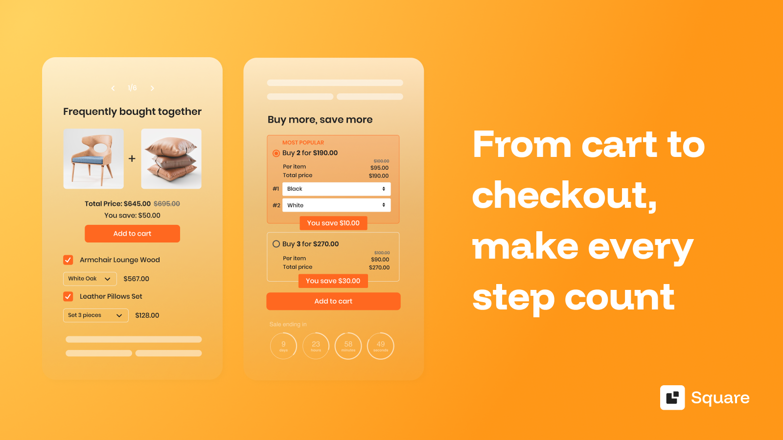 Square Upsell Builder increases your AOV with powerful tools like product bundles, frequently bought together and volume discounts. Show one-click post-purchase upsells, unlock spending goal discounts, or reward bigger orders with free products — all fully customizable and easy to launch. Perfect for pre-purchase, in-cart, or post-checkout deals, Square Upsell Builder gives you everything you need to upsell your products.