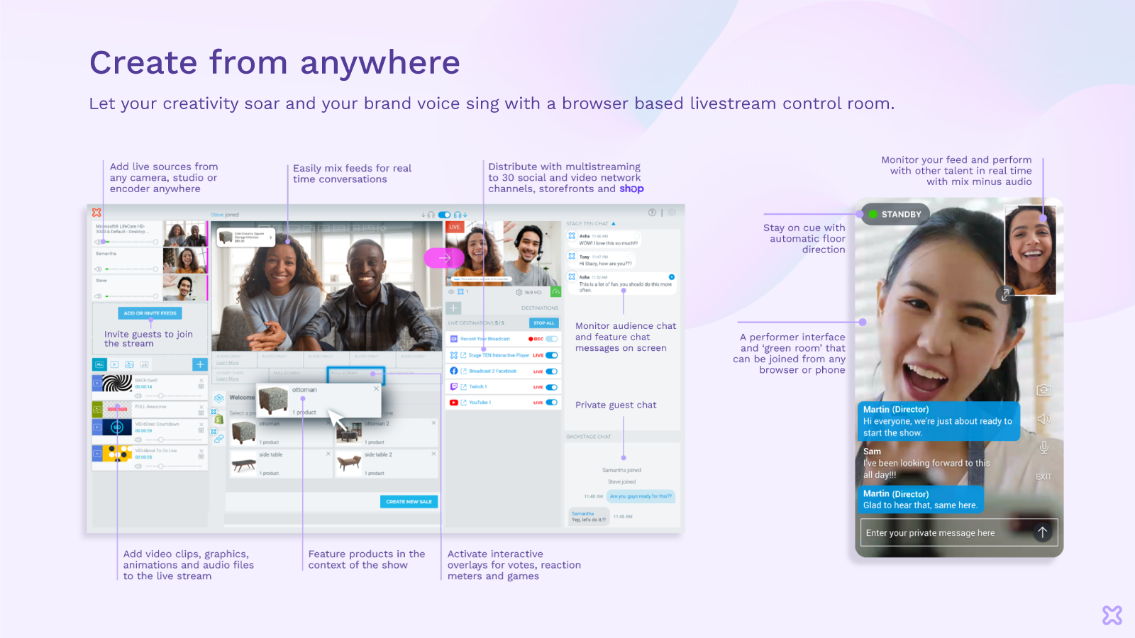 With Stage TEN you simply connect your store, go live and start a conversation with your customers. Live shopping on your storefront and Shop app builds community with personal connections and drives sales. Stage TEN streams in real time so you can talk to customers like they’re in the same room, answer their questions and thank them when they buy on screen. The Stage TEN Studio lets you easily create: Ask Me Anythings, Interviews, VIP Events, Product Drops, Shopping Games, and Product Demos.