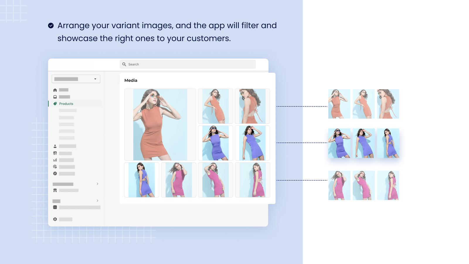 Show multiple variant images of the selected variant. Give your product page a clean & professional look, and improve customer experience & conversions. You don't need to manually assign variant images to each variant. Simply arrange images in Shopify product admin & the app will group variant images automatically. Unlike other apps, we keep your image gallery style & functionality intact. We do not add a new image gallery to the product page, minimizing the impact of the app on your store.