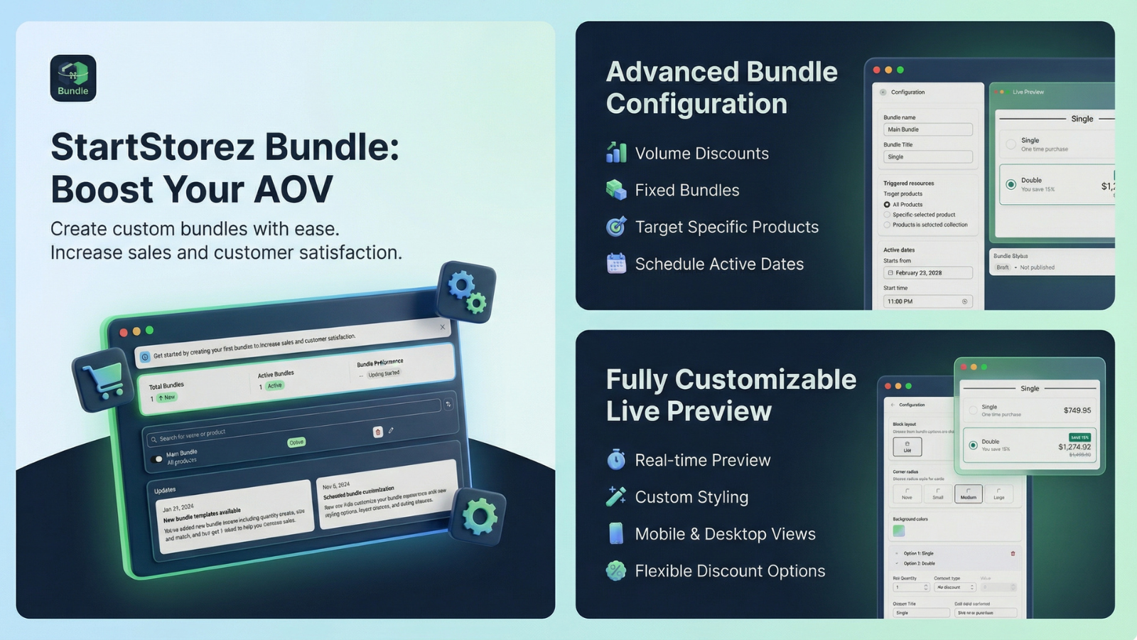 StartStorez Bundle lets merchants create personalized product bundles and volume discounts from the Shopify admin. Design flexible offers, highlight product pairings, and display tiered discount structures to support multi-item purchases. The app integrates smoothly with any theme and provides customizable layouts to match your store branding. Simple setup, clean presentation, and full control over bundle configurations.