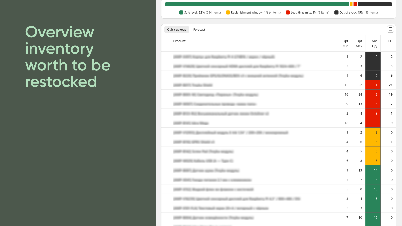 Stock Roll provides analytics for each of your inventory items. It includes demand, current stock, forecast for future periods, and computed optimal min/max levels along with recommended quantity to replenish right now. The app gives supply chain managers an idea of how much to buy for the warehouse to avoid out-of-stock and not overspending at the same time.
