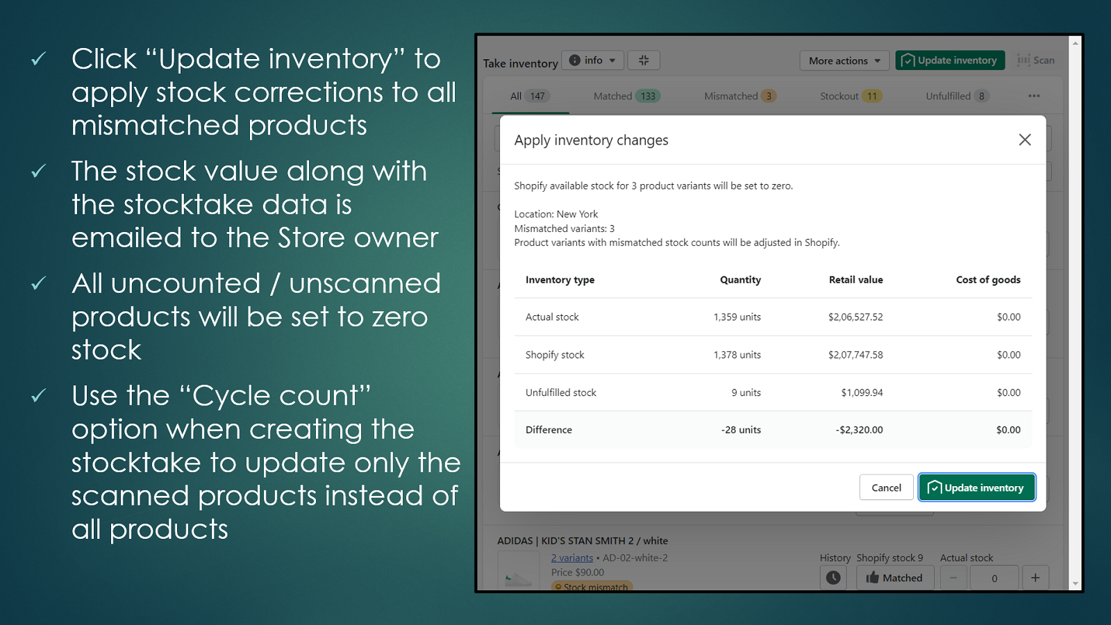 Select products to count by Shopify location, scan inventory barcodes or physically count your items, then have our app adjust any stock errors and zero out any uncounted products. No need to install a separate barcode scanning app on your device. Inventory stocktake in your browser with a handheld scanner or directly in the Shopify mobile or POS app with your Apple or Android phone camera. Get your stock value and a detailed inventory report in CSV format after you complete a stock count.