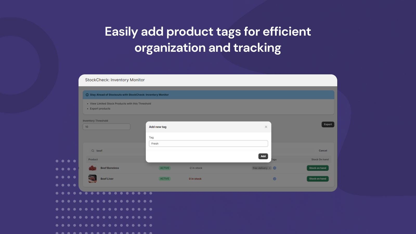 Our app helps merchants easily track the low-stock products in their stores. Our app is a quick and simple solution to help you always restock your products on time. Also, our app exports low-stock products to Excel for seamless management and analysis. You can also easily add product tags for efficient organization and tracking. Track total items, retail value, and variant availability on the stock.