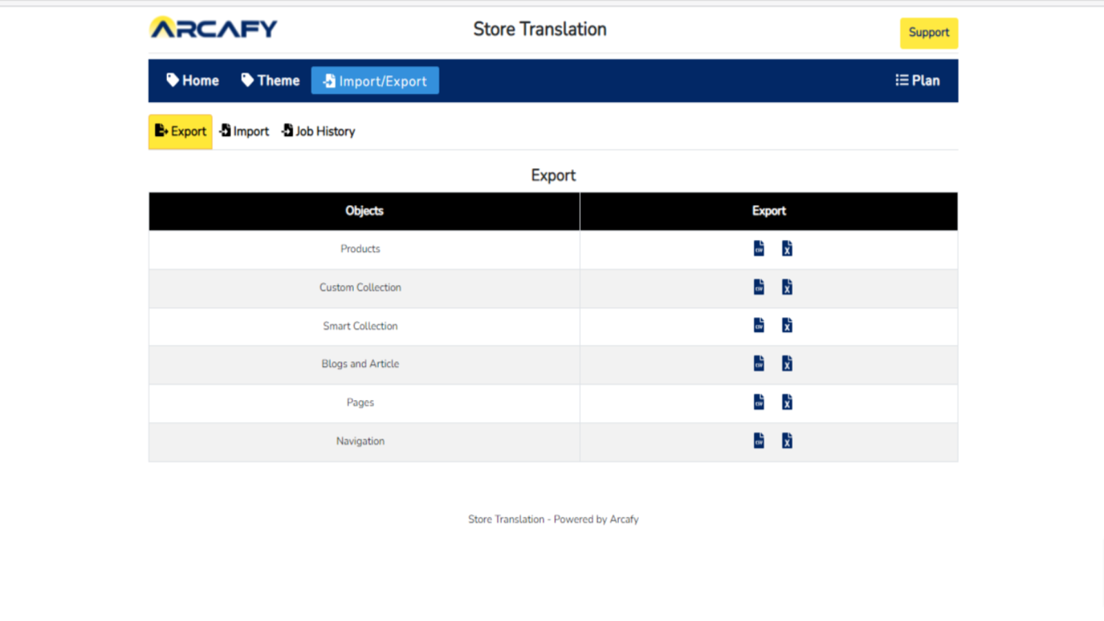 Store Translation Supreme App is an easy way to organize and manage your shop's language data. Add new languages, publish/unpublish new languages, add Shopify native objects. CSV Import-Export Excel Import-Export Import-Export Job History Supported Native Objects: Products Variants Collections Blogs Articles Pages Navigation Shop details Shop Policies Shop Configuration: Theme data Email / SMS templates Delivery methods / Packing slips Payment gateway Metafields