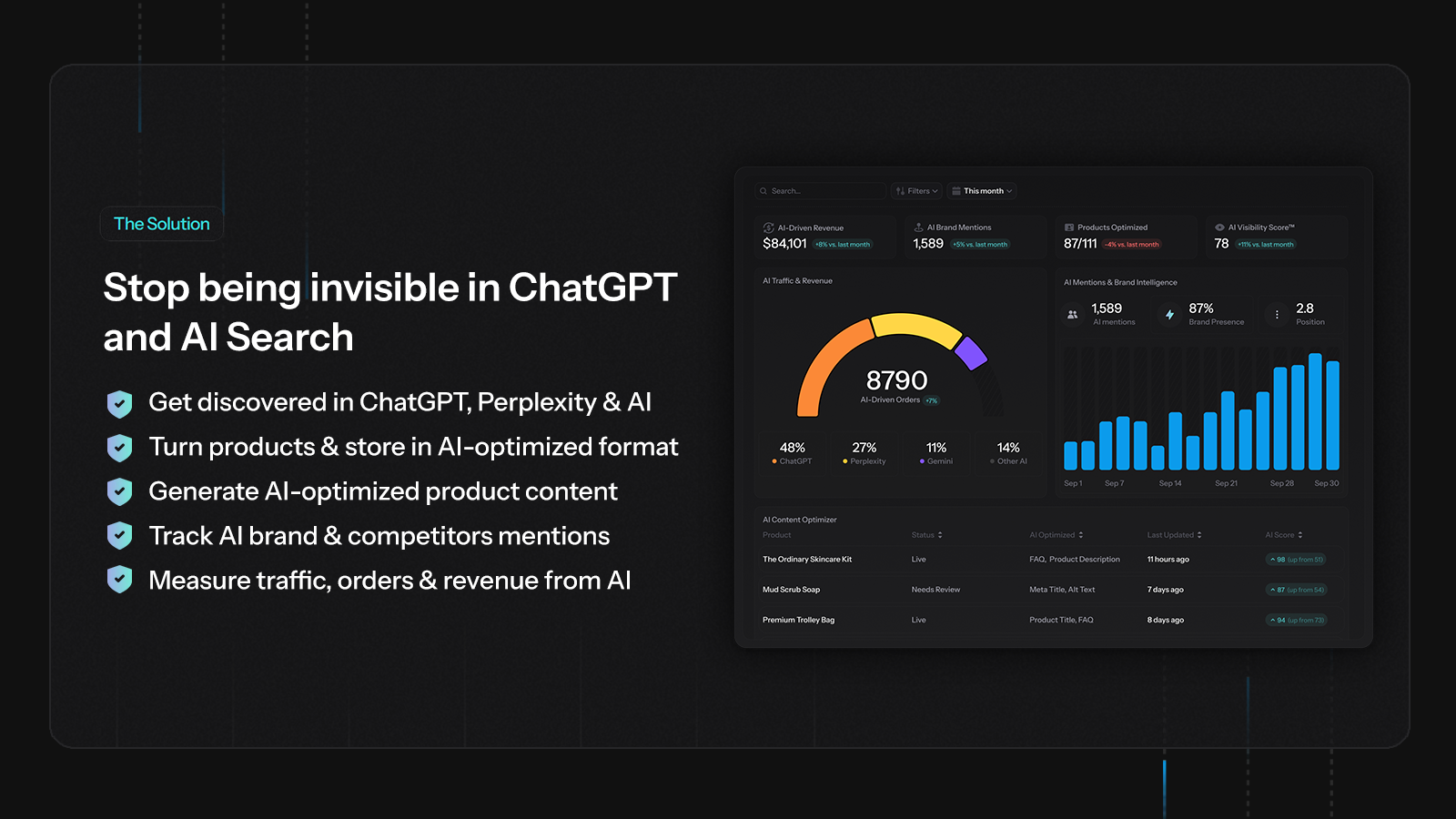 Most stores are invisible in AI search. Tools like ChatGPT, Perplexity, Gemini and Claude can’t understand unstructured product data. StoreRank.ai makes your store AI-searchable by automatically adding optimized schema, FAQs, and product content. Track your brand mentions across AI platforms, see which sources are cited, and measure AI-driven revenue. Install once, and your store is continuously optimized without theme conflicts or manual setup.