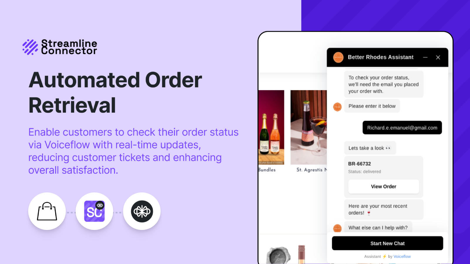 Streamline Connector integrates your store with Voiceflow, allowing your AI agents to provide in-stock product recommendations, order checking for customers, and answers to common questions. It ensures your AI agents have the latest data without manual input or coding, with updates monthly, weekly, daily, or hourly. This reduces the need for frequent API calls, keeping your AI agents accurate and efficient.