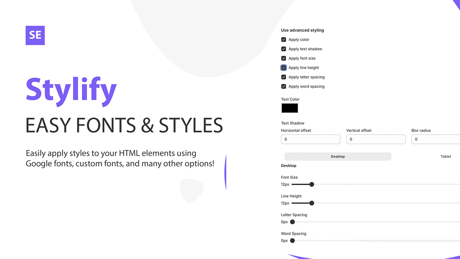 Easily apply styles to your HTML elements using Google fonts, custom fonts, and many other options!