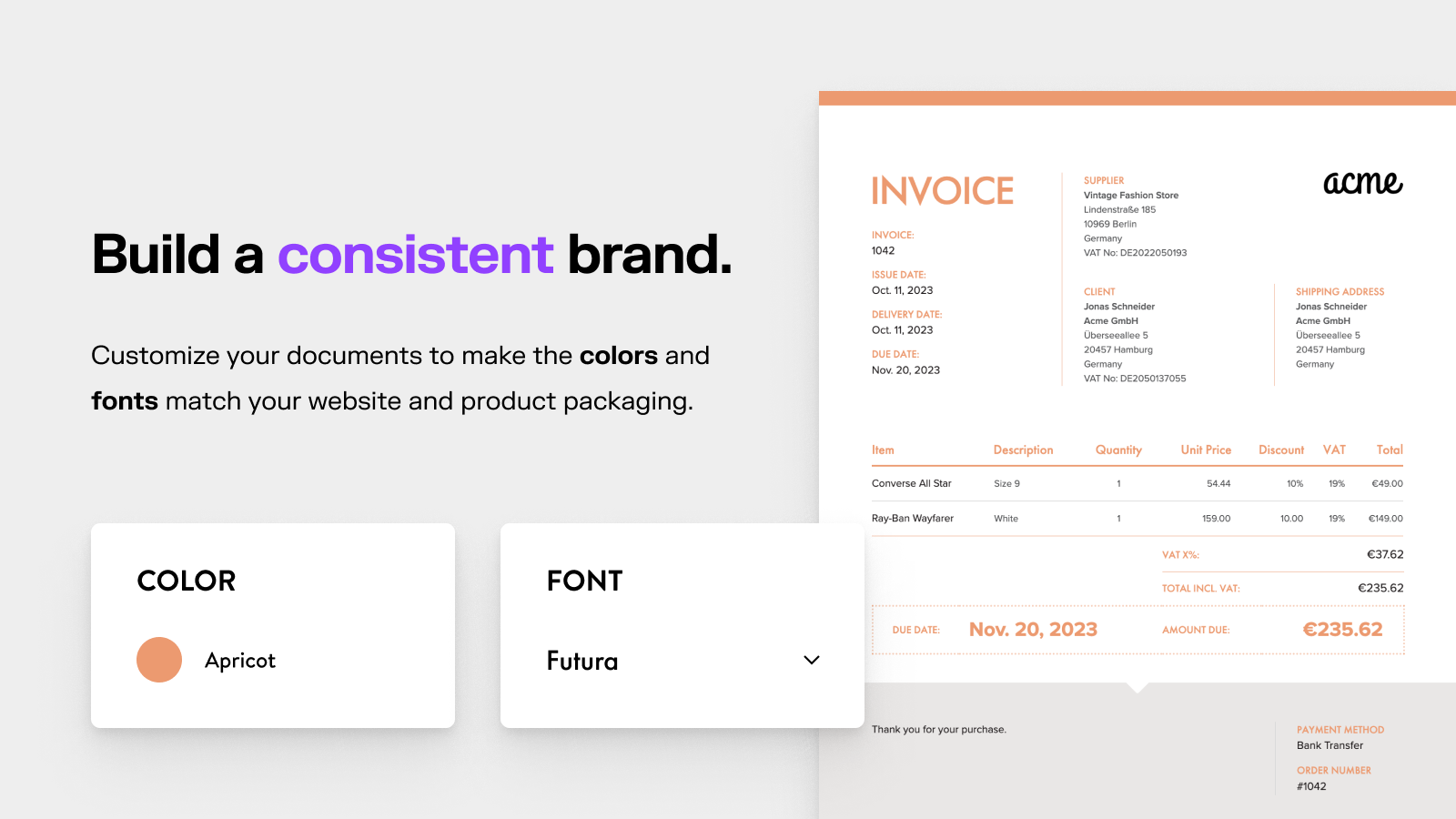 Automatically create and send professional invoices, credit notes, and other documents. Build powerful custom workflows that cater to your business needs. Our invoices are validated by certified accountants, ensuring your documents meet worldwide regulations for both B2C and B2B sales. Build your brand with professionally designed and easy-to-customize invoice templates. Stand out and impress your customers. Our stellar support team will help you correctly configure your invoices and taxes.