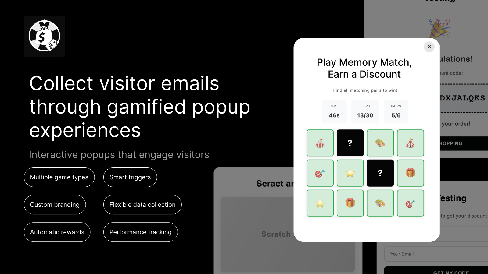 Create email collection pop-ups with gamified elements like spin-to-win wheels, scratch cards, and interactive games. Configure exit-intent triggers, timed displays, or cart-abandonment prompts to engage visitors. Provide discount codes as incentives for email opt-ins. Customize pop-up design to match your branding and set display rules for specific pages or customer segments. Email addresses sync automatically to your Shopify customer database and connect with email marketing platforms.