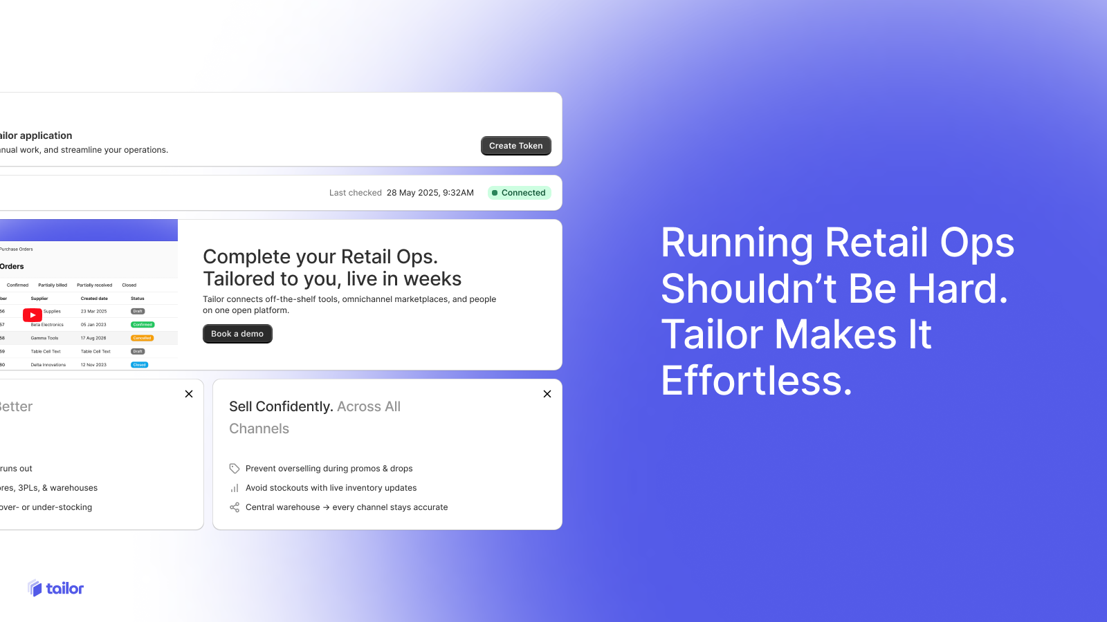 Tailor is a headless, low-code ERP that centralizes post-order operations for Shopify brands. Sync orders, products, inventory and fulfillments; manage purchasing, production, and warehouses; and automate tasks with Pipelines, Triggers, and serverless Functions. Connect tools like ShipStation, Loop and QuickBooks via pre-built integrations, or extend via API. Go live in weeks with hands-on implementation, training and support.