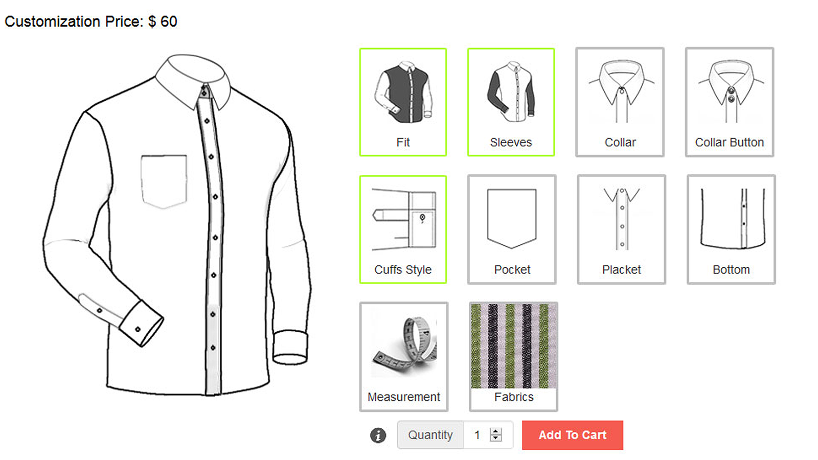 Shoppers can create or customize shirts online. Your customers can create their own shirts & have it tailored to accurate measurements for a perfect fitting. Option to select their favorite fabrics, sleeves, collar, cuffs, pocket etc. & customers can see the preview of his designed shirt while selecting options. They can set all the measurements of the shirt. Extra price for custom design can be set from admin and many other customization are available
