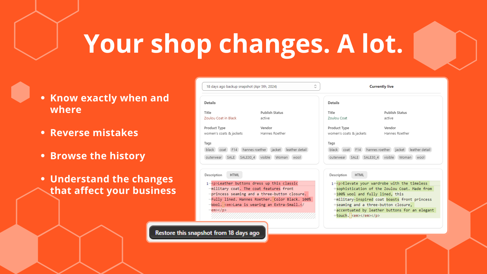 You need to update themes, add apps, modify product descriptions, or edit other shop content. Each change to your shop carries the risk of irreversible data loss. Talon Backups keeps track of your shop's most important data and maintains a continuous history of all changes. Make changes to your shop with confidence. Review how your shops content and data change over time. And in doing so, you can be confident that you can undo those changes at any time.
