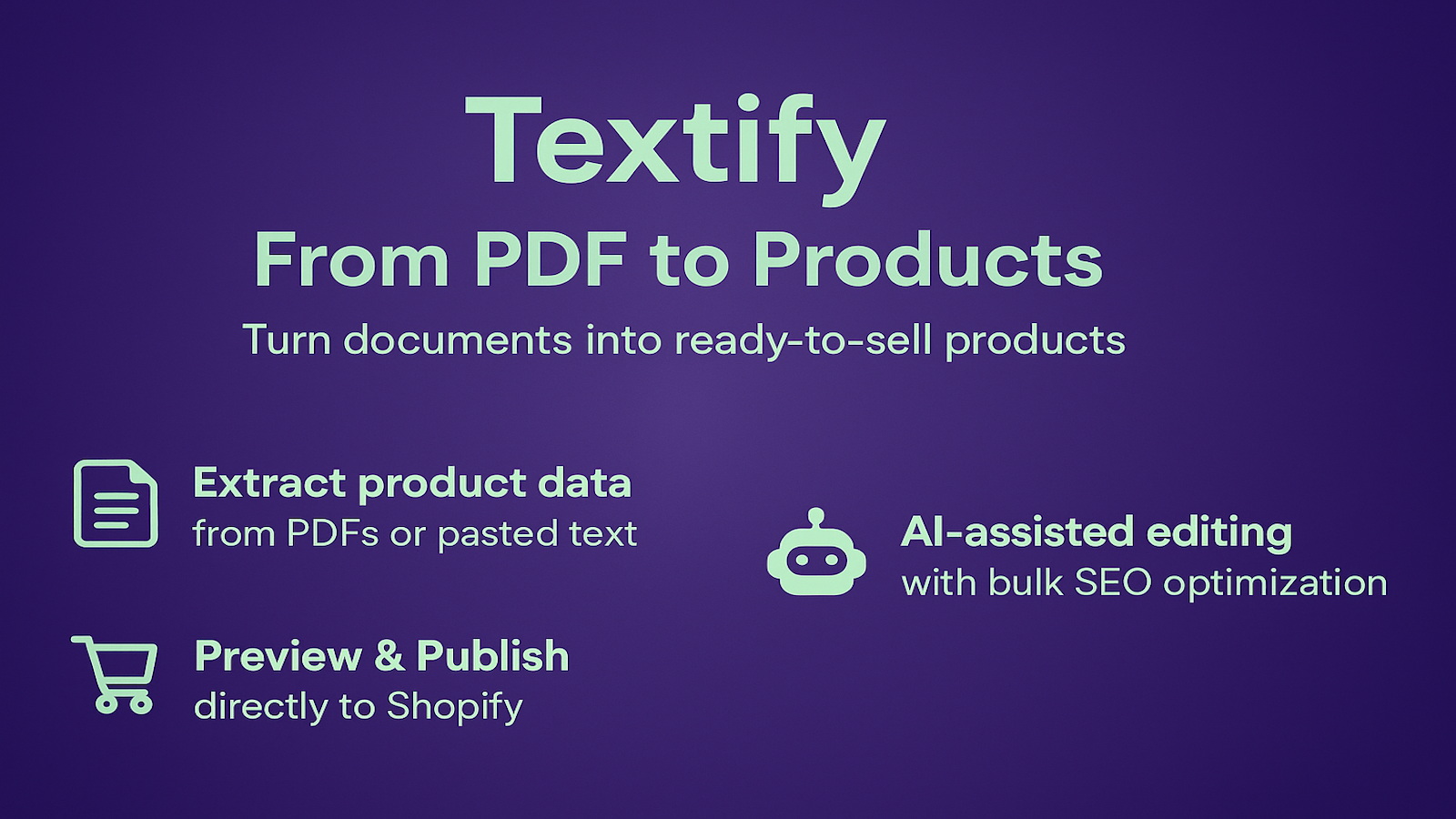 Textify helps merchants turn unstructured product data from any file like a PDFs or text into ready-to-sell products with variants in any language. Upload a file from your supplier products or a simply invoice, alternatively paste content, let AI extract product details, then refine them with SEO suggestions. Preview products in bulk and publish directly to your Shopify store, saving hours of manual entry.