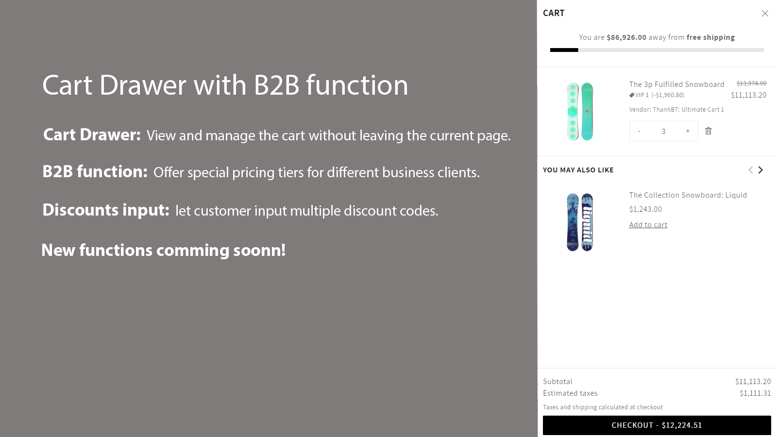 Enhance your Shopify store with our app, featuring a sleek cart slide and powerful B2B functionalities. The cart slide offers a dynamic shopping experience, allowing customers to view and manage their cart without leaving the current page. Our B2B features include custom pricing and customer-specific discounts, ensuring competitive and flexible pricing for your business clients. Perfect for both retail and wholesale, our app ensures a seamless and efficient shopping journey for all customers. Tr