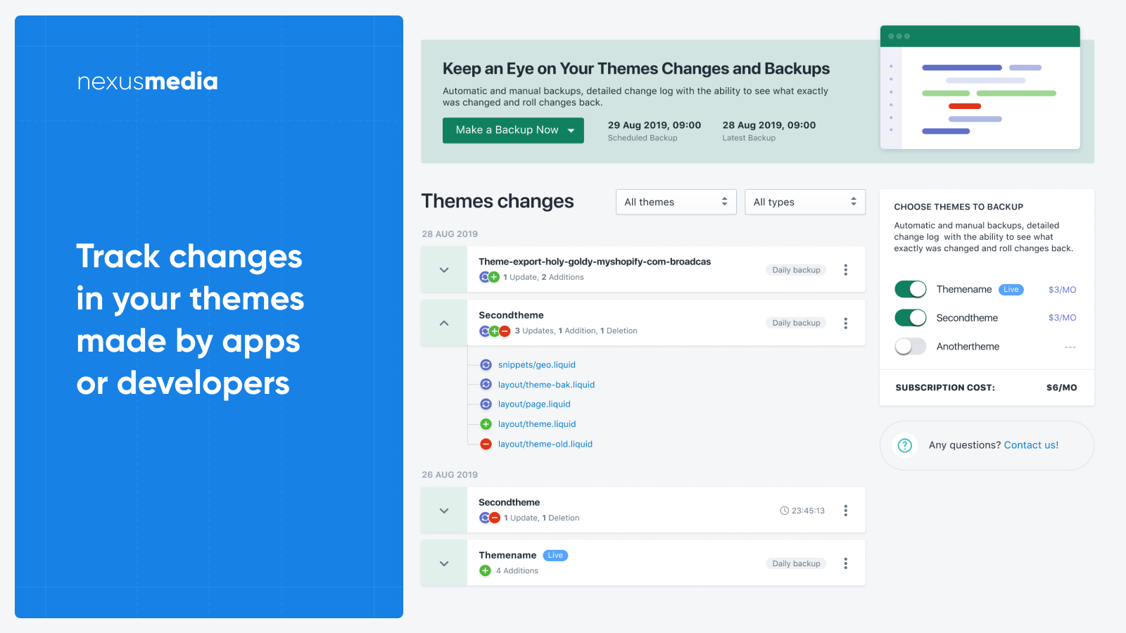 ThemeWatch is a theme backup tool and changes tracker. Automated daily backup for you to keep your theme safe. Check which files were changed in your theme today. Manual backups before important changes. Track differences in particular assets. Create a manual theme backup to ensure you'll be able to remove any 3rd-party app code. Easily restore a particular asset, or the whole theme. Enjoy peace of mind and never lose your theme's progress again.