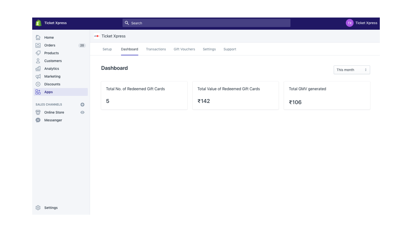Ticket Xpress is a new-age, mobile-first, smart & secure Digital Voucher platform to generate, distribute and authorise all kinds of value, product and service e-vouchers for your customers in a simple, centralised & cost-effective way. Our digital smart voucher system enables loyalty & rewards programs to be more responsive, relevant, easy to manage and easy to use. This app helps you to integrate Ticket Xpress Voucher Redemption on Shopify Stores.