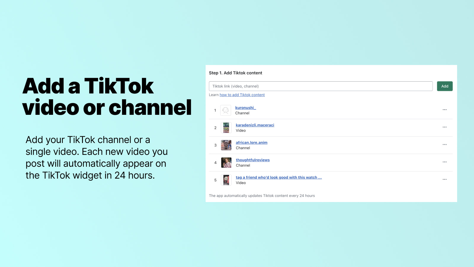 Show off your fantastic TikTok content on your website using a TikTok widget! Include a single video or your whole channel, presented in Carousel, Grid, or Video layouts. Customize your feed's appearance effortlessly—no tech skills needed. Each new video you post will automatically appear on the TikTok widget, boosting visitor engagement and conversion rates. Easily connect TikTok for Shopify store .