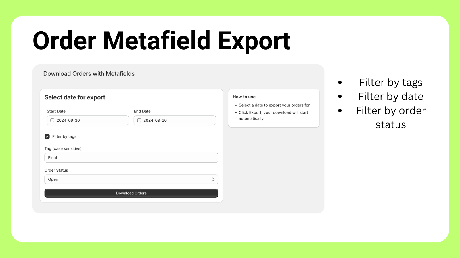 Many merchants require metafield data to be used in other external systems. Order Metafield Export allows you to access this data in easy to use, CSV format.