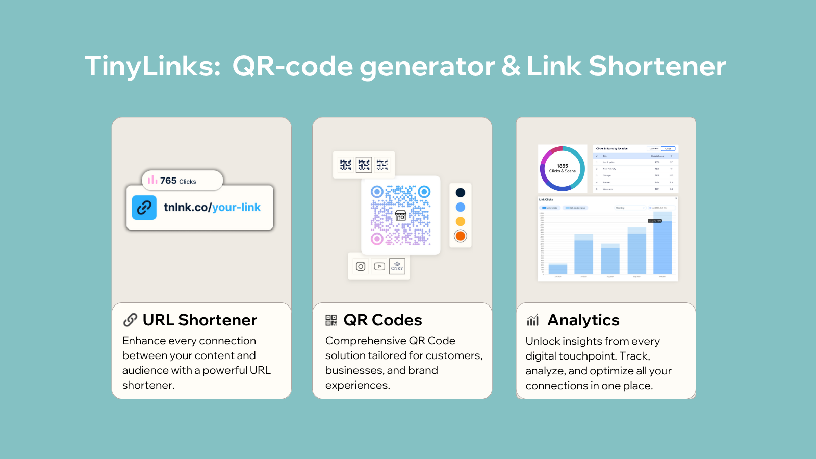 Create QR codes and short links, track analytics, and use custom domains with TinyLinks