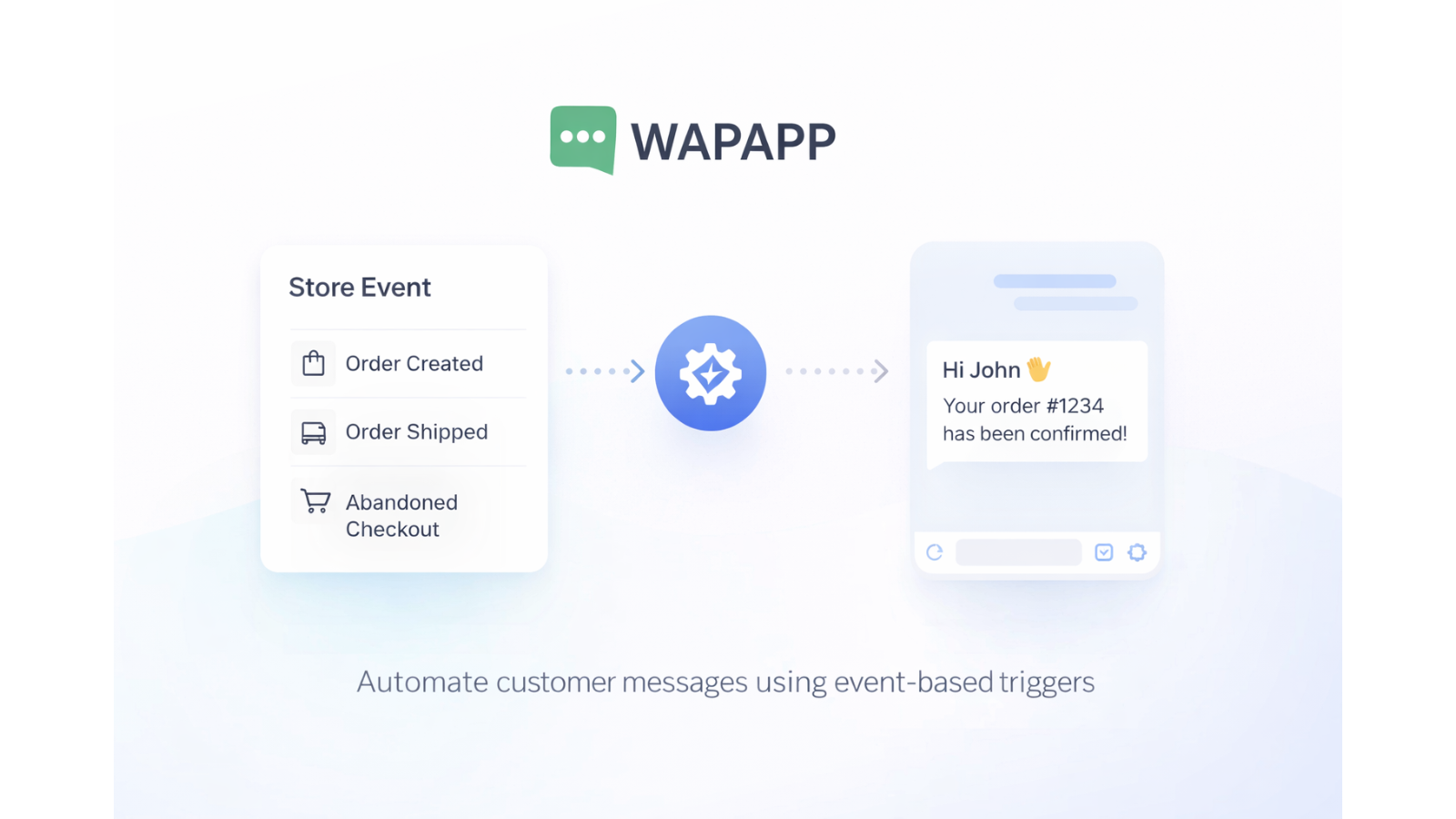 Send automated WhatsApp notifications triggered by store events using WAPAPP APIs.