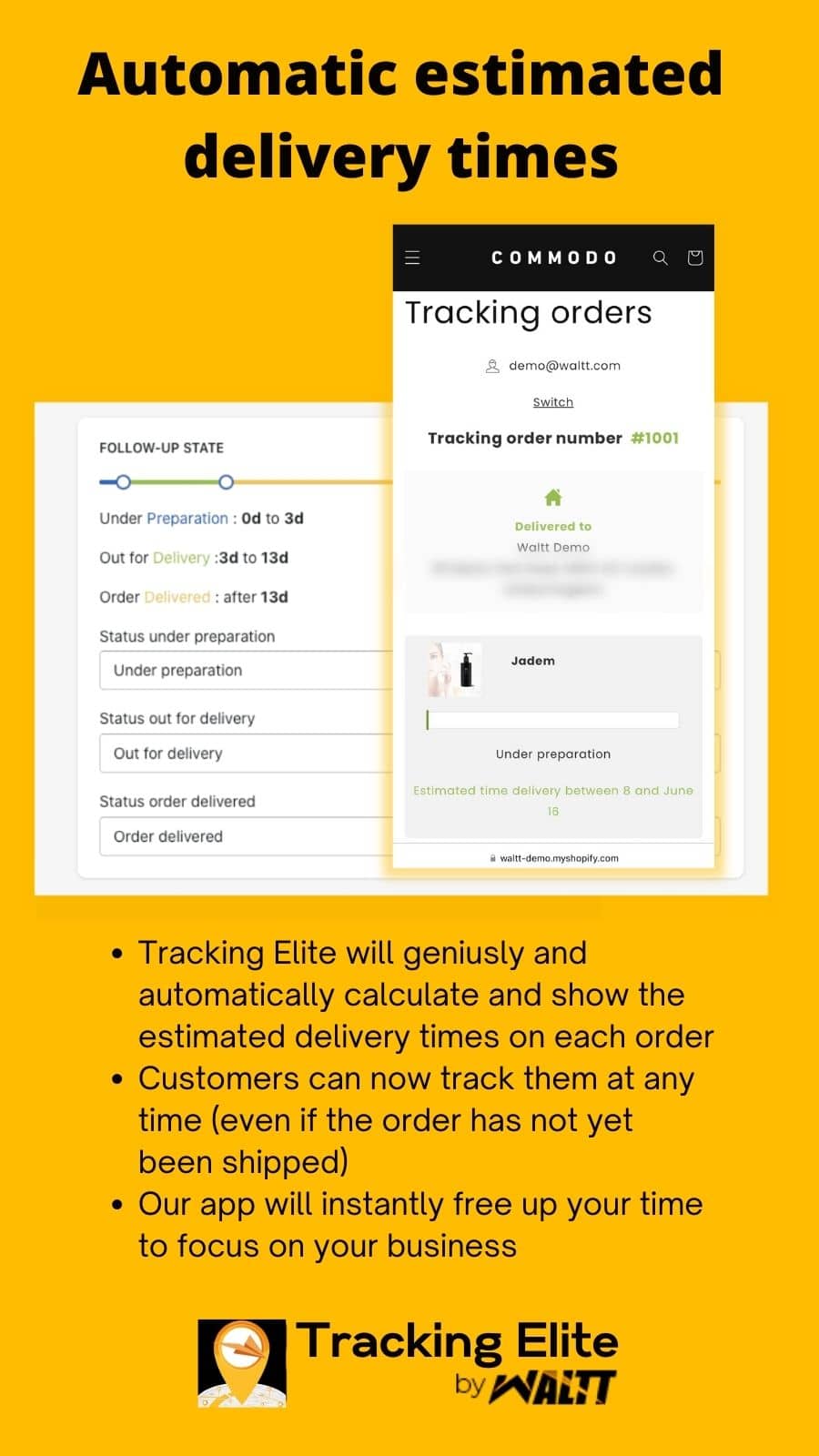 Tired of answering the same question from your customers over and over again: "where is my order?" Do you dream of unclogging your customer service with an application that can read your customers' minds and avoid receiving hundreds or even thousands of emails every month? Tracking Elite will geniusly and automatically calculate and show the estimated delivery times on each order. Customers can now track them at any time (even if the order has not yet been shipped).