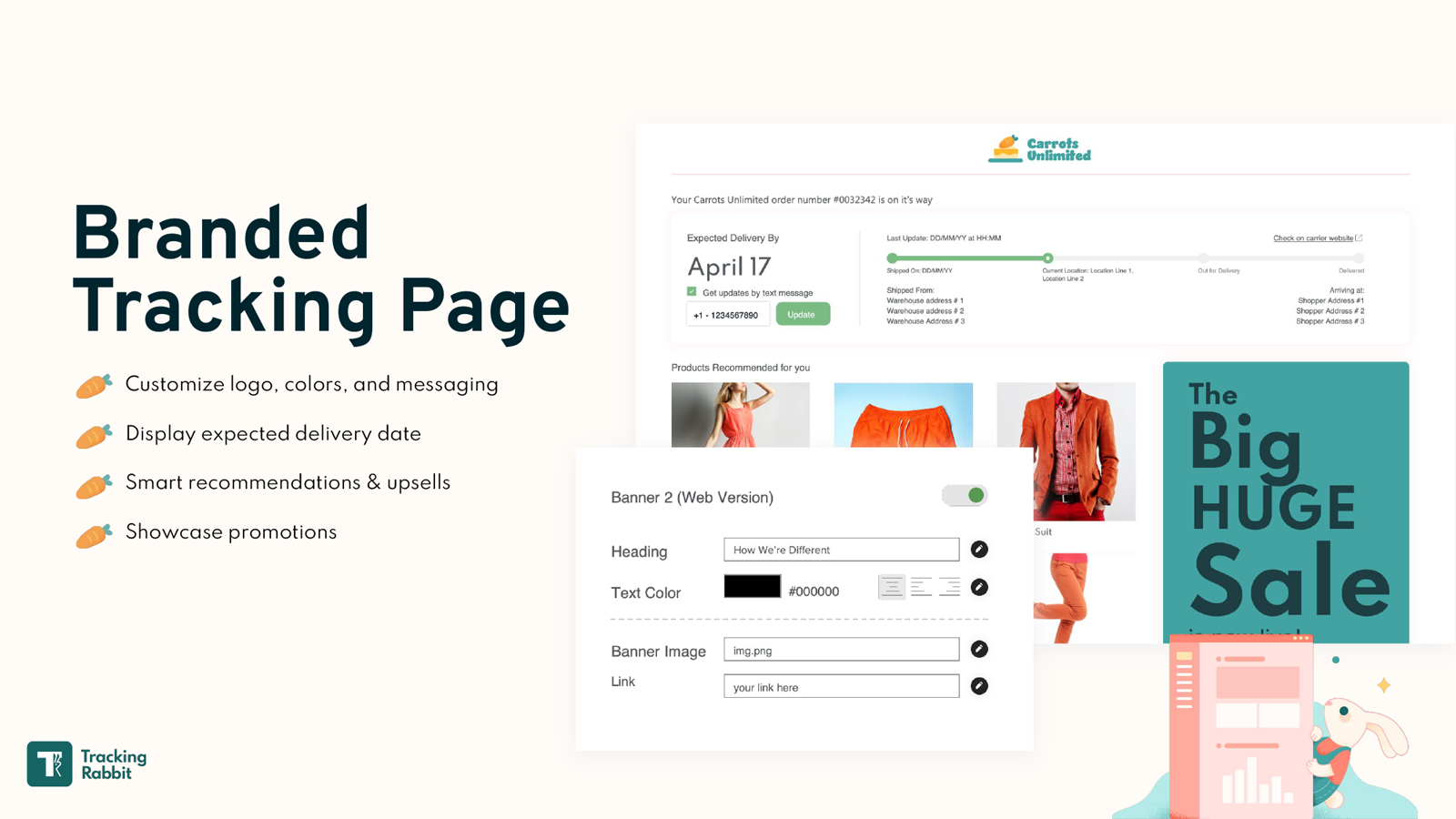 Tracking Rabbit reinforces your brand, improves customer satisfaction, and boosts your sales through order tracking. Tracking Rabbit lets you give customers a branded experience, from custom shipping notifications to an order tracking lookup page. Plus, upsells, sales messages, promotions, and even customizable product recommendations. No more triaging customer service WISMO questions across social media DMs, emails, webforms, and phone calls!