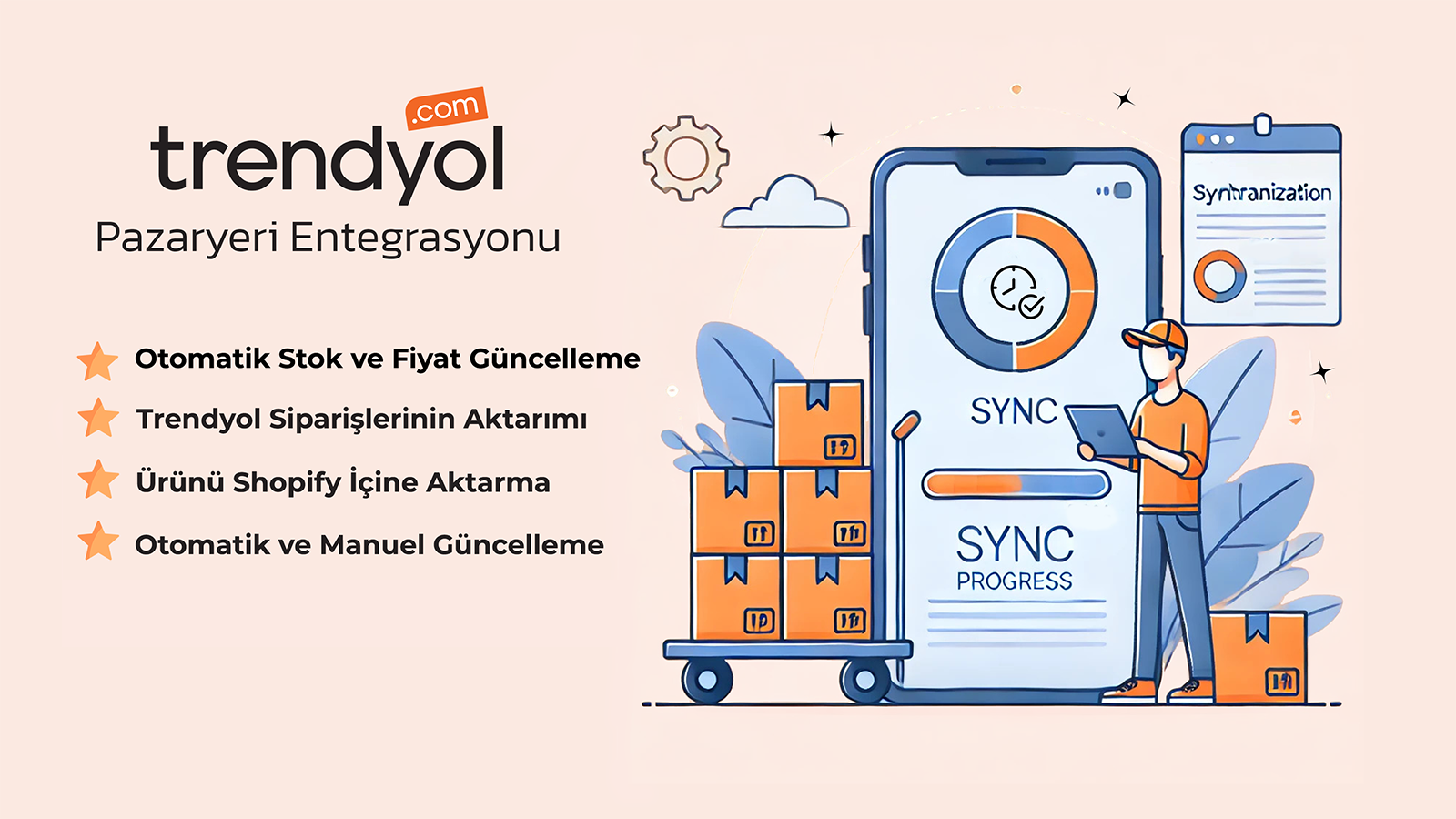 Trendyol kanalı sayesinde, Shopify içinde Trendyol ürünlerinizi kontrol edebilirsiniz; Trendyol'daki ürünlerinizi uygulamada listeleyebilirsiniz, Trendyol ürünlerinizin Stok ve Fiyat bilgilerini ister otomatik, ister manuel olarak senkronize edebilirsiniz. Shopify üzerinden veya Trendyol'dan sipariş aldığınızda ürün stokları iki tarafta da otomatik eşitlenir. Trendyol sipariş senkronizasyon özelliği sayesinde siparişlerinizi Shopify Siparişler sekmesinden görüntüleyebilirsiniz.