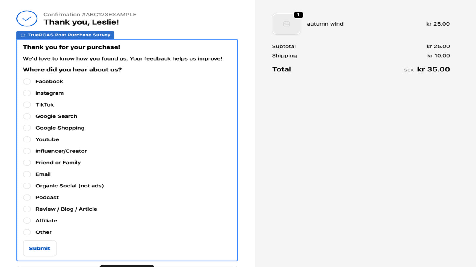 TrueROAS Post Purchase Survey adds a simple "How did you hear about us?" survey to your checkout thank-you page. When customers complete a purchase, they can select from common marketing channels like Facebook, Instagram, TikTok, Google, YouTube, podcasts, influencers, or enter a custom response. This first-party data helps you understand which marketing channels are actually driving sales, giving you direct customer feedback that complements your analytics tools. Survey responses are collected.