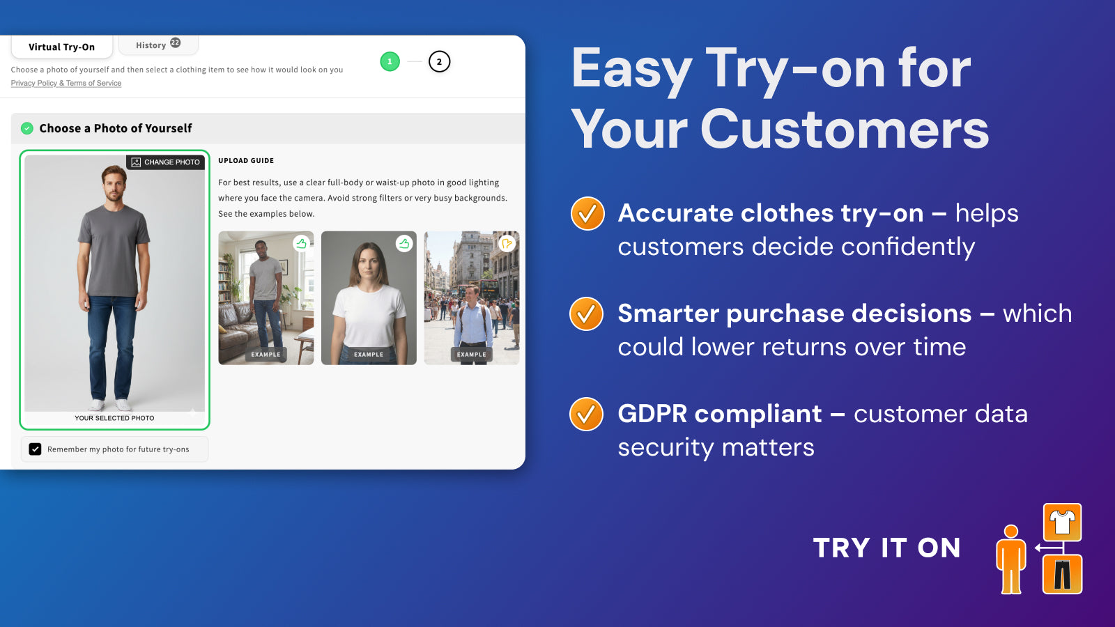 Try It On lets your customers upload a photo and instantly see how your products look on them using AI visualization, giving them a realistic preview in seconds. Customers can easily download their try-ons and view their try-on history. Photos are processed in real-time and locally stored avoiding storage on our severs. The app Includes built-in translations for frequently used languages, customizable design options, mobile-optimized experience with user privacy in mind.