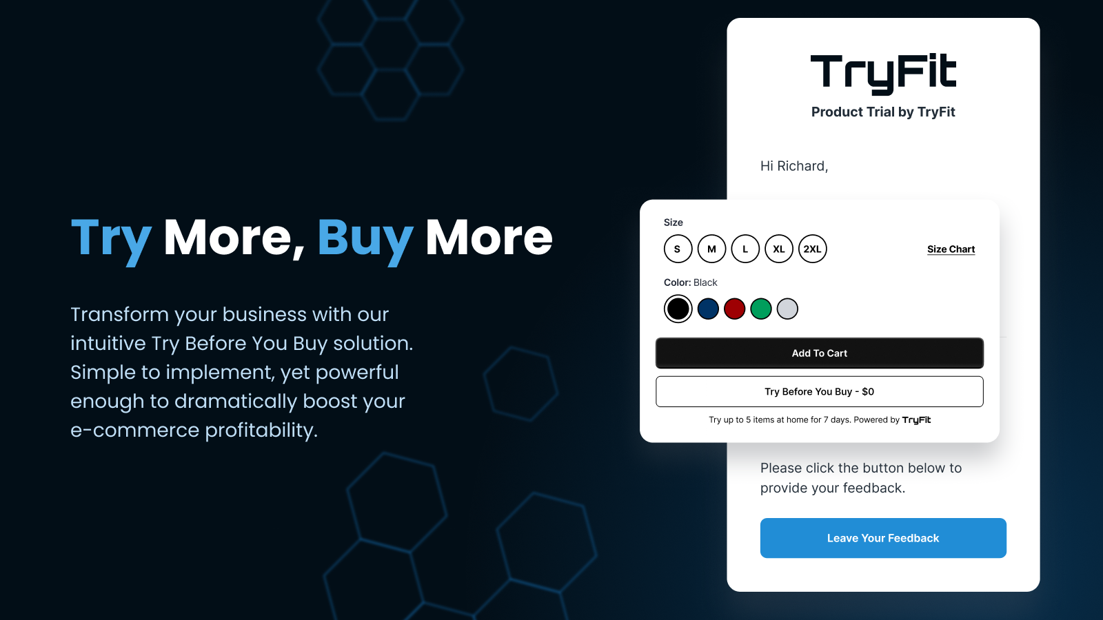 Elevate your brand with our seamless Try Before You Buy platform, designed specifically for growing Shopify brands. Empower customers to experience your products before committing, dramatically increasing conversion rates and AOV. TryFit helps to build customer confidence, and drive sustainable revenue growth—all while creating the frictionless shopping experience today's consumers demand. Let shoppers try products at home and keep what they love, thereby helping to decrease hesitation.