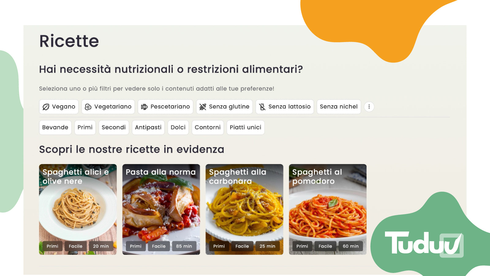 Tuduu - Sell with recipes ti permette di trasformare le ricette in un canale di vendita intuitivo, potenziando visibilità sui motori di ricerca e conversioni. Le ricette saranno associate ai tuoi prodotti e-commerce e gli utenti potranno trasformare con un solo click gli ingredienti in carrello della spesa, filtrando anche la ricerca in base alle loro preferenze nutrizionali.