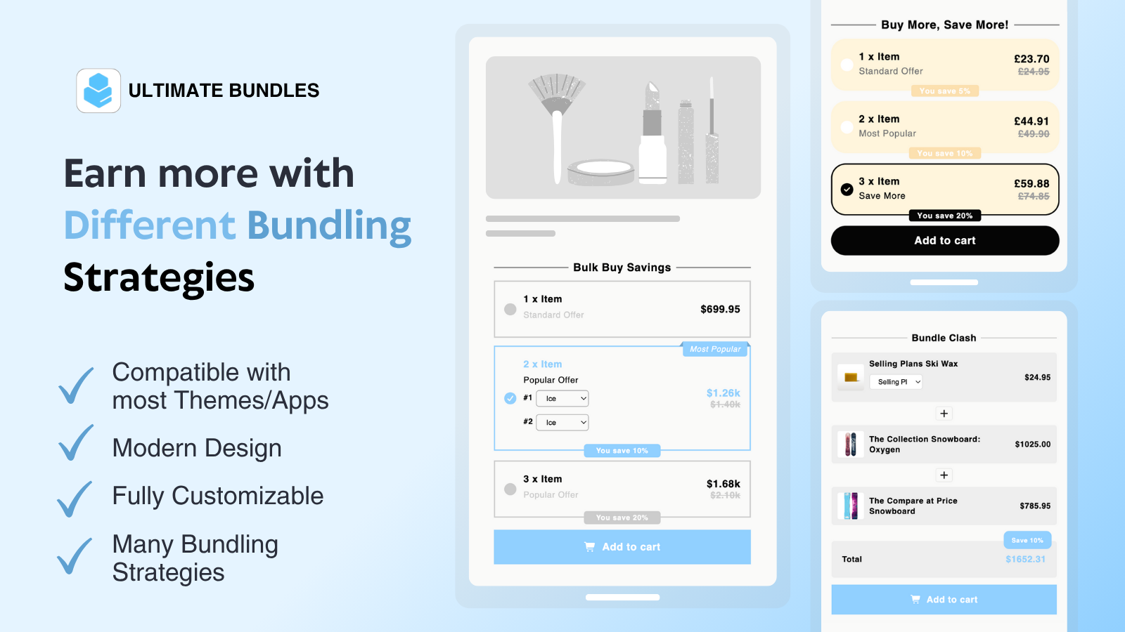 Ultimate Bundles helps merchants create flexible discount offers. Create volume discounts (buy more, save more), fixed bundles, and combo product offers that display directly on product pages. Set up campaigns in minutes with our intuitive interface, customize colors to match your brand, and track performance with built-in analytics. No coding required.