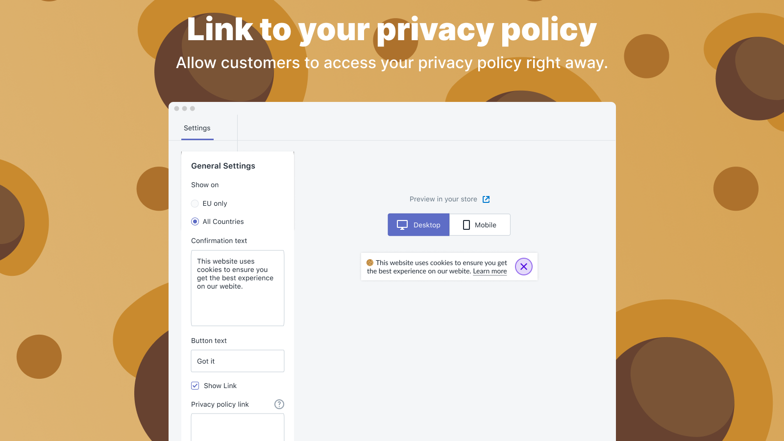 Stay GDPR compliant with Ultimate GDPR! Our app creates a customizable GDPR cookie banner with just one click. Fully customize the design of your cookie banner with options to change colors, fonts, text, and layout to match your brand. Our EU cookie bar informs your customers that your store uses cookies, and the banner automatically closes once the customer clicks on the button. Our legal cookies solution works seamlessly with all Shopify themes & layouts. Install our cookie bar app now!