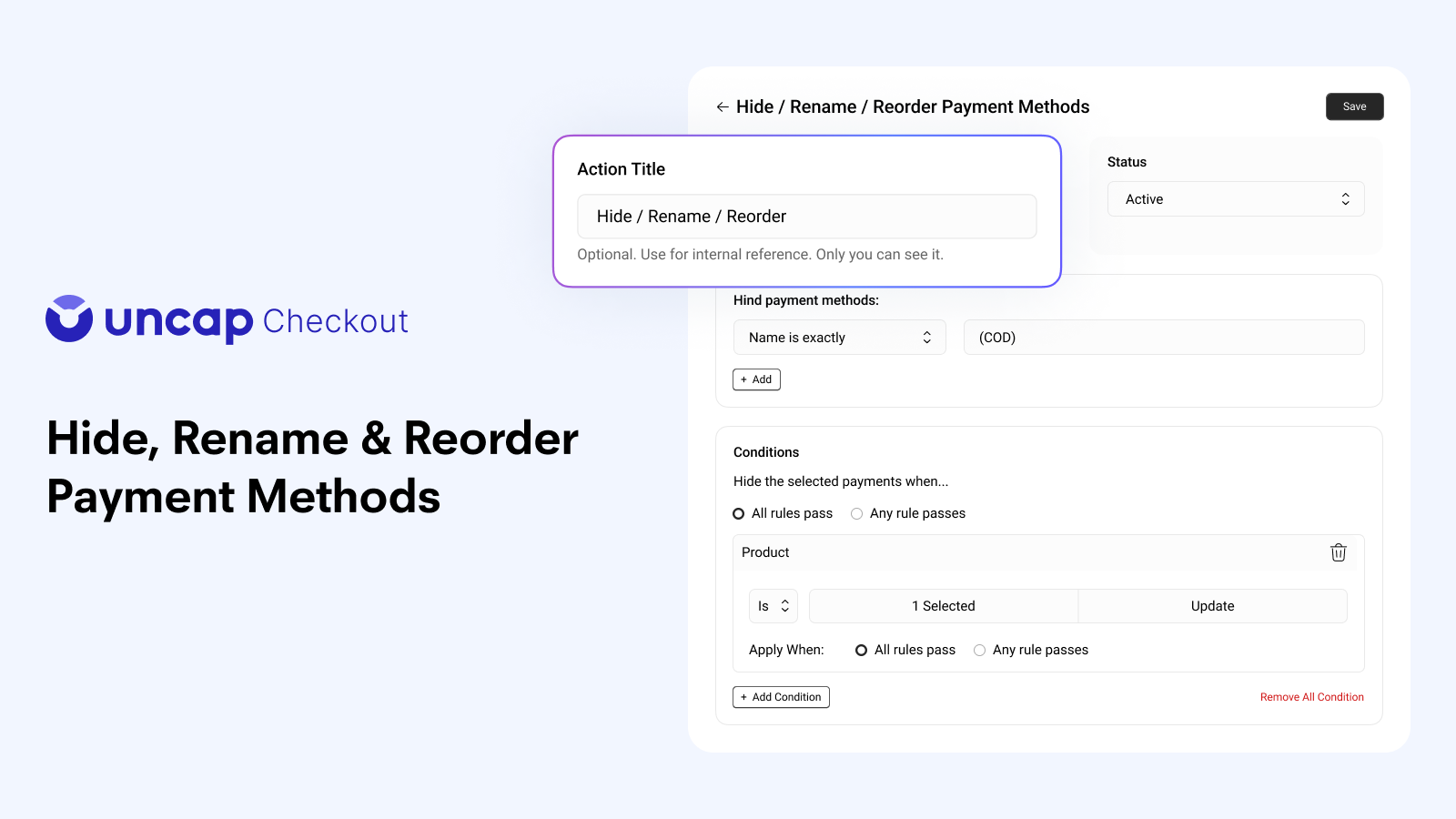 Gain full control over your store checkout by dynamically hiding, renaming, or reordering payment & shipping methods based on specific conditions. Customize options based on cart contents, order value, shipping address, customer tags, product vendors, and more. Whether you want to simplify choices for your customers or highlight preferred methods, our flexible rules help you deliver a personalized & streamlined checkout process—ultimately boosting conversions & improving customer satisfaction.