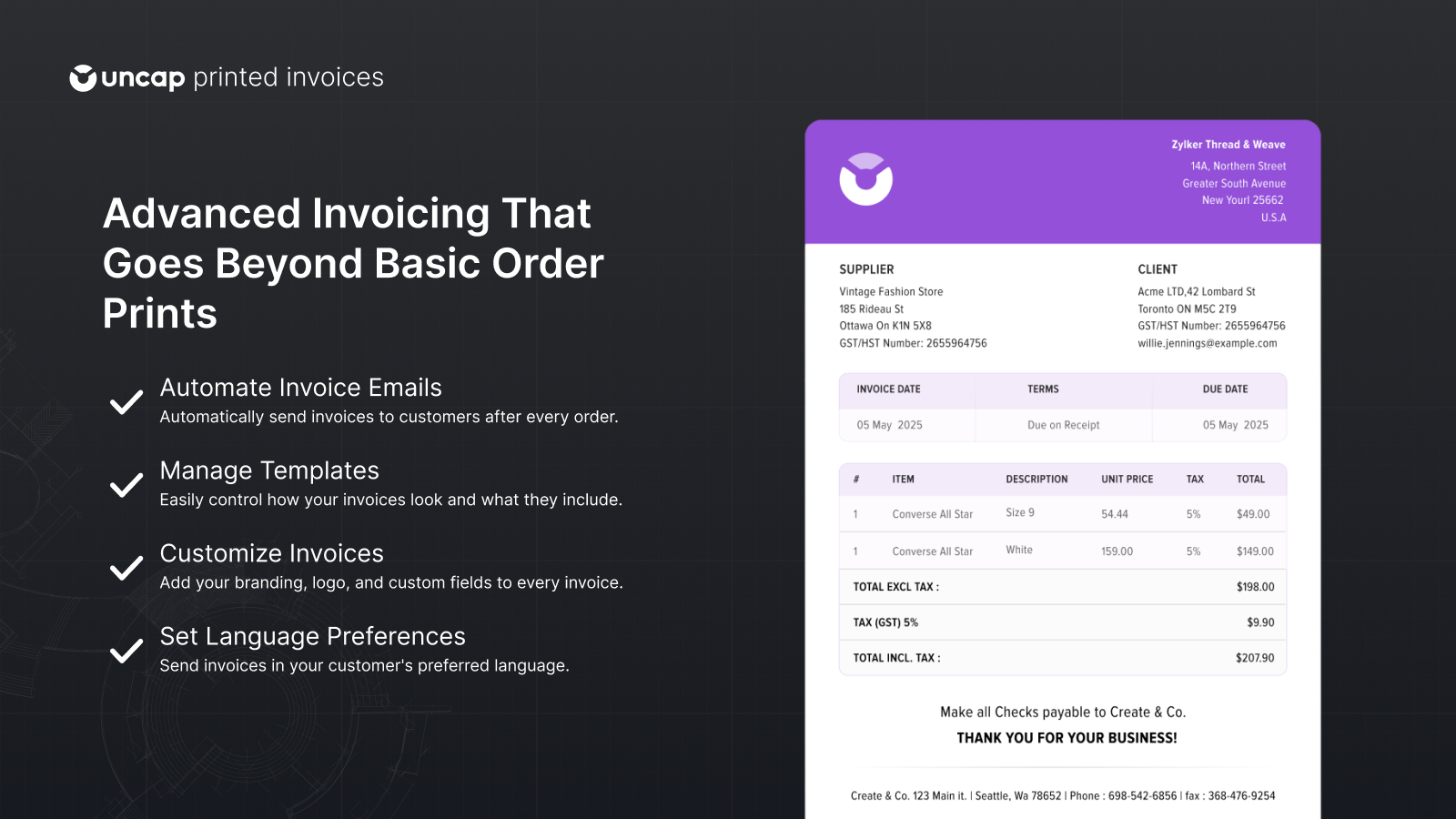Uncap Printed Invoice streamlines your order fulfilment with automated, professional invoice generation. When orders are updated, customised invoices are instantly created and emailed to customers as PDF attachments.