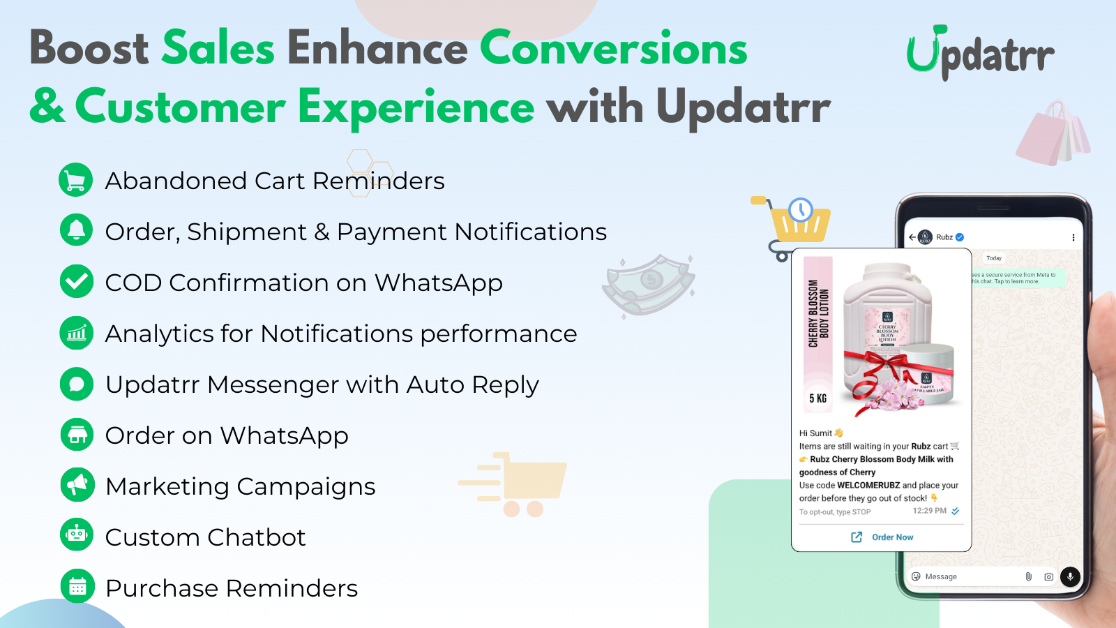 Updatrr is the ultimate Shopify app to boost customer engagement with personalized WhatsApp notifications. Recover lost sales with abandoned cart alerts, keep customers informed with real-time order updates, and reduce RTO with COD confirmation. Features include WhatsApp Abandoned Cart, Order Updates, Chat, COD Confirmations, Marketing Campaigns, and seamless Integration. Simplify communication and drive conversions with Updatrr.