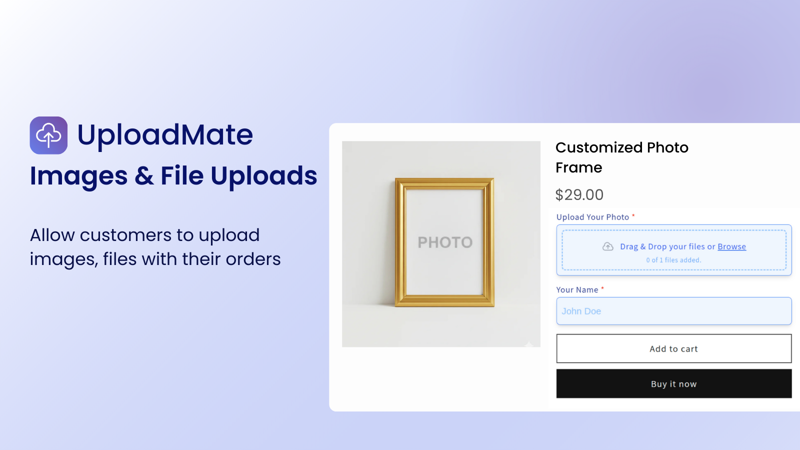 UploadMate makes it simple to let your customers upload images, files, or documents directly on your Shopify store. Perfect for custom products, print-on-demand, or personalized gifts, all uploaded files are linked to the order and easily accessible in your Shopify dashboard.