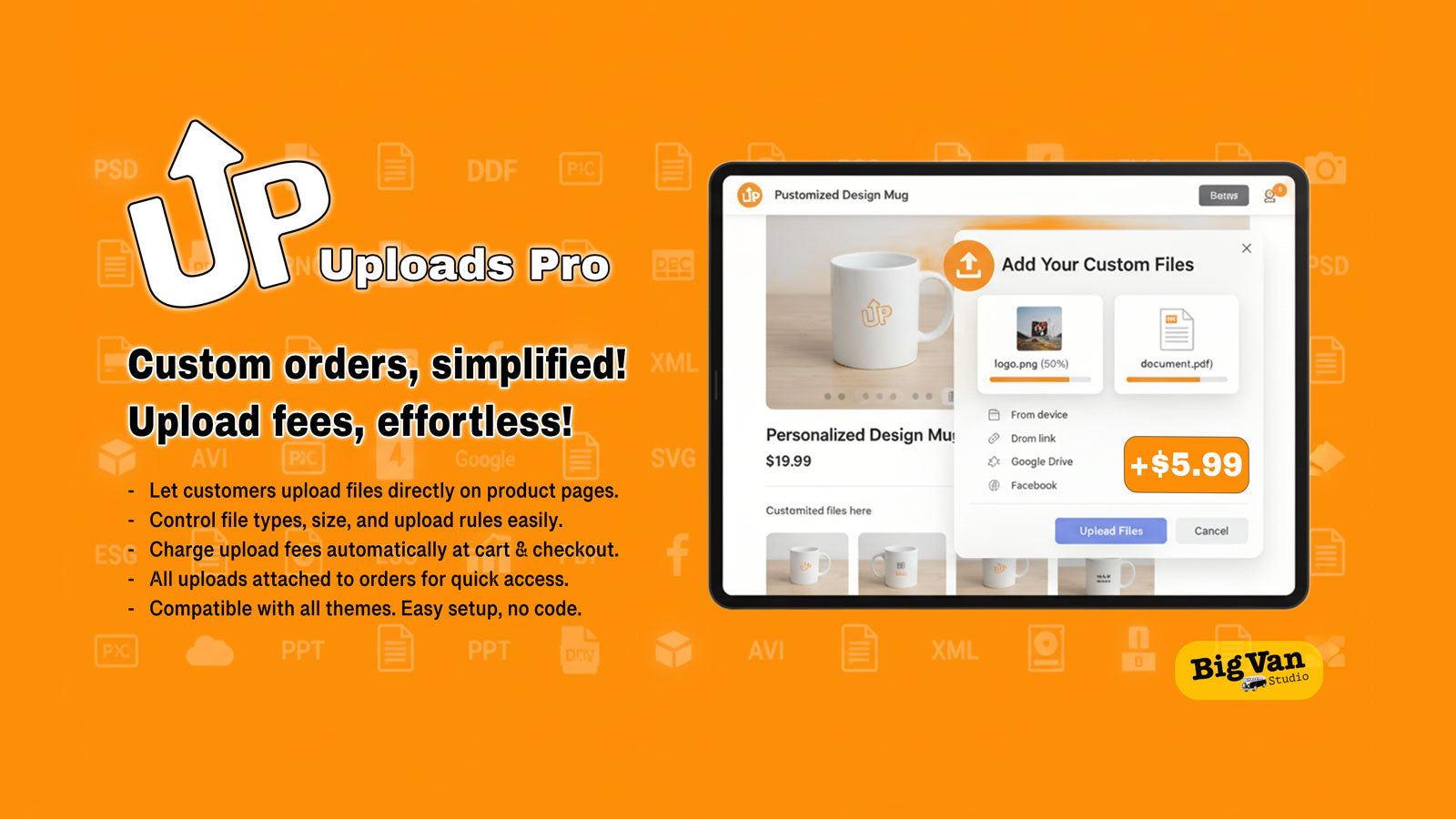 UploadsPro lets customers upload files directly on product pages for custom orders. Perfect for personalized products, printing services, and any business requiring customer files. Set upload fees to create additional revenue or cover processing costs. Control file types, sizes, and make uploads required or optional. Works with Shopify 2.0 and legacy themes. Files link automatically to orders for instant fulfillment access. No coding required - install through the theme editor in minutes.
