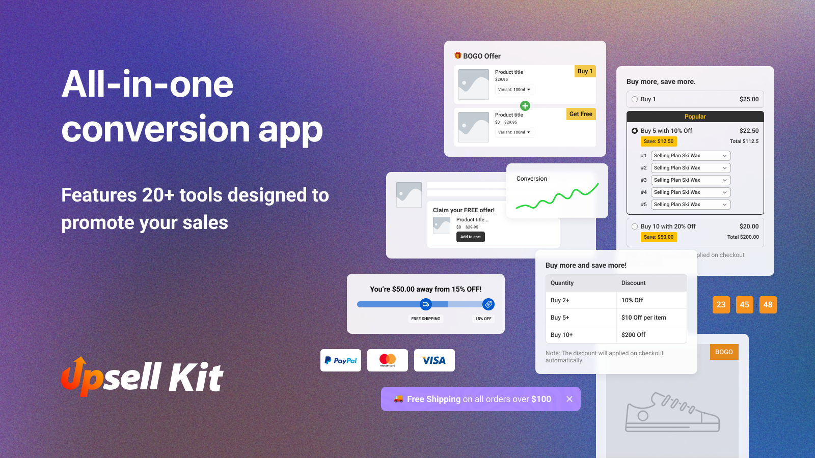 Boost sales with strategic upsells, cross-sells, and sales-enhancing features like countdown timers, stock alerts, free shipping, trust badges, BOGO offers, quantity discounts, and order rewards. Optimize your conversion funnel with tools like sticky add-to-cart, content protection, age verification, and more to drive conversions and increase revenue.