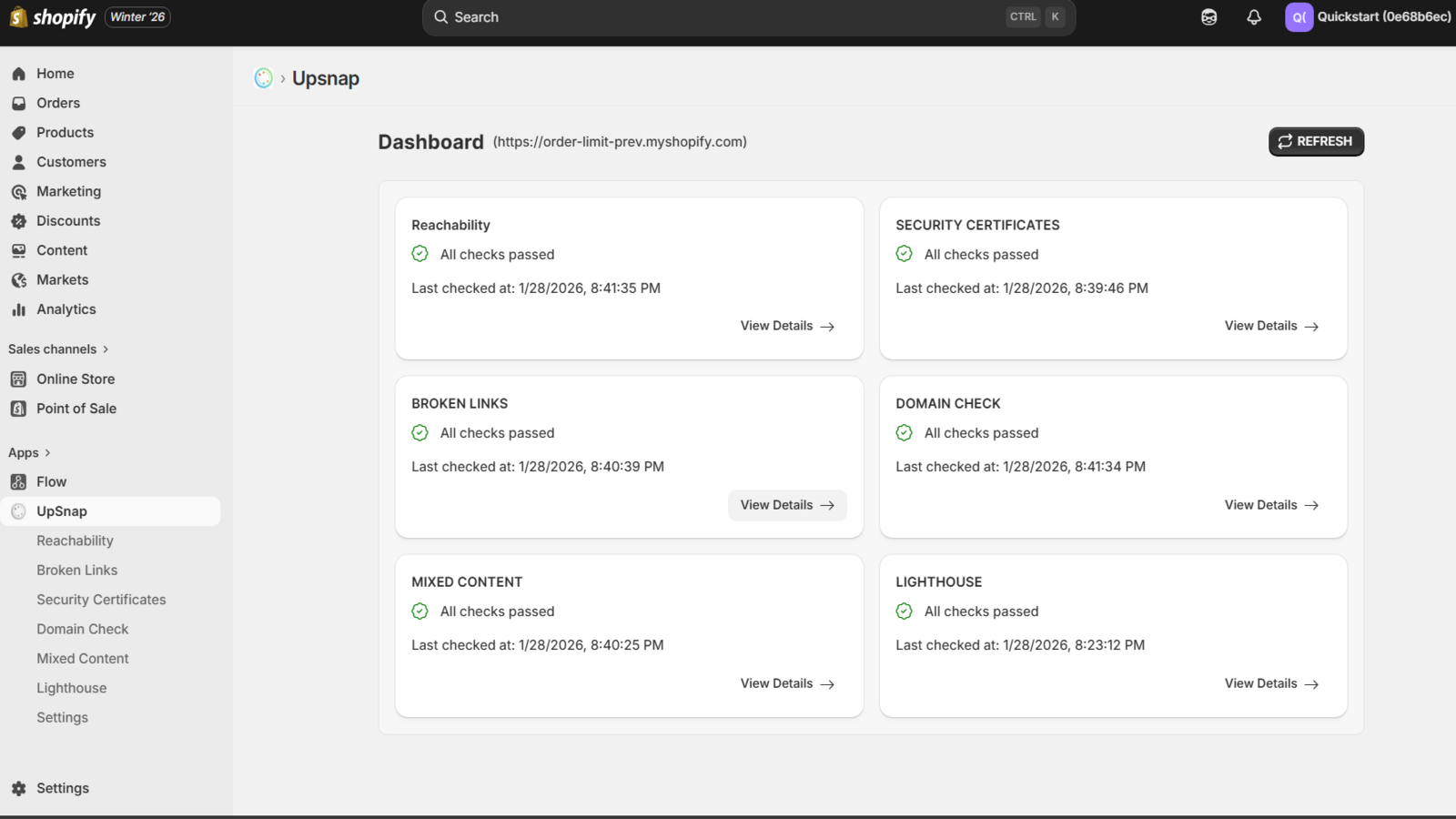Upsnap monitors website uptime and performance to help merchants detect outages and issues early. It regularly checks important pages and alerts users when problems occur, enabling faster response and reduced disruption. With simple setup and continuous monitoring, Upsnap helps maintain a stable and reliable online experience.