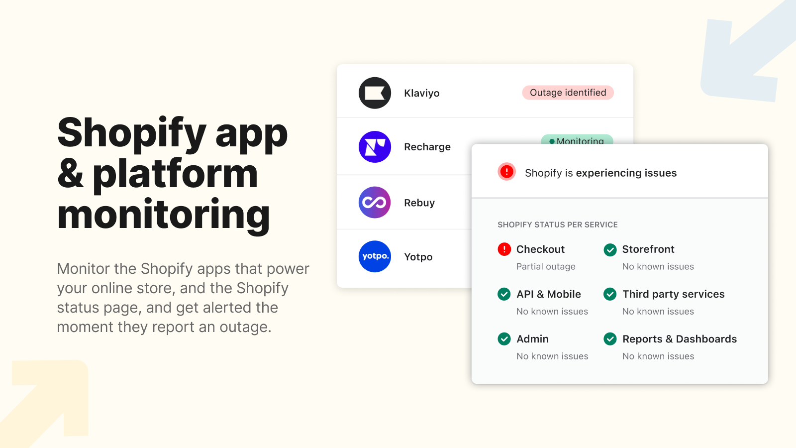 Monitor, detect, and resolve store issues using the same platform as Rockport, Branch, OVO, Kettle&Fire, & hundreds of other Shopify Plus brands. Our automated testing and downtime monitoring ensure you know the moment there's an issue that could impact your revenue. We’ve detected thousands of store issues, saving merchants' sales, protecting ad spend, and expediting resolution. Simple to setup, catch issues before your customers do, like broken add to cart/checkout, broken Shopify apps, & more