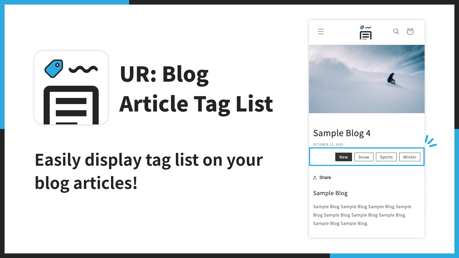"UR: Blog Article Tag List" helps merchants organize and display blog tags directly on article pages. You can flexibly show or hide specific tags, highlight important ones, and fully customize the tag design without coding. Ideal for content-focused stores and blogs that want to improve readability and navigation. With this app, readers can easily explore related content, boosting engagement and SEO performance.