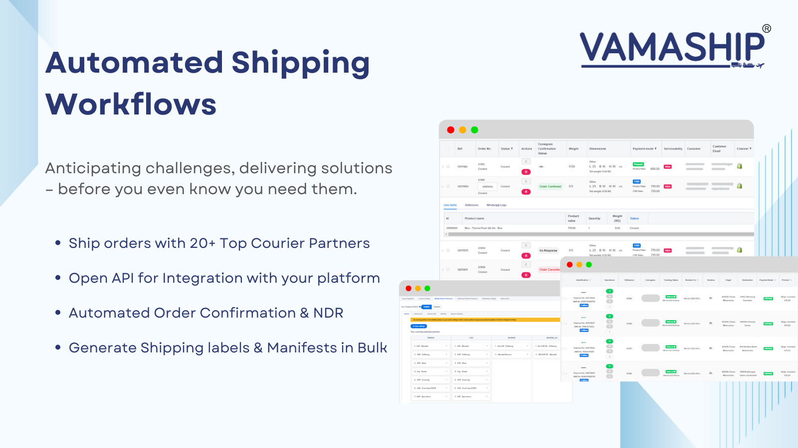 Vamaship simplifies shipping for Indian businesses by enabling e-commerce and D2C brands to effortlessly manage and fulfill orders through a single platform. Integrate your Shopify store with Vamaship to gain access to a wide network of 30+ courier partners covering 28000+ pincodes across India.