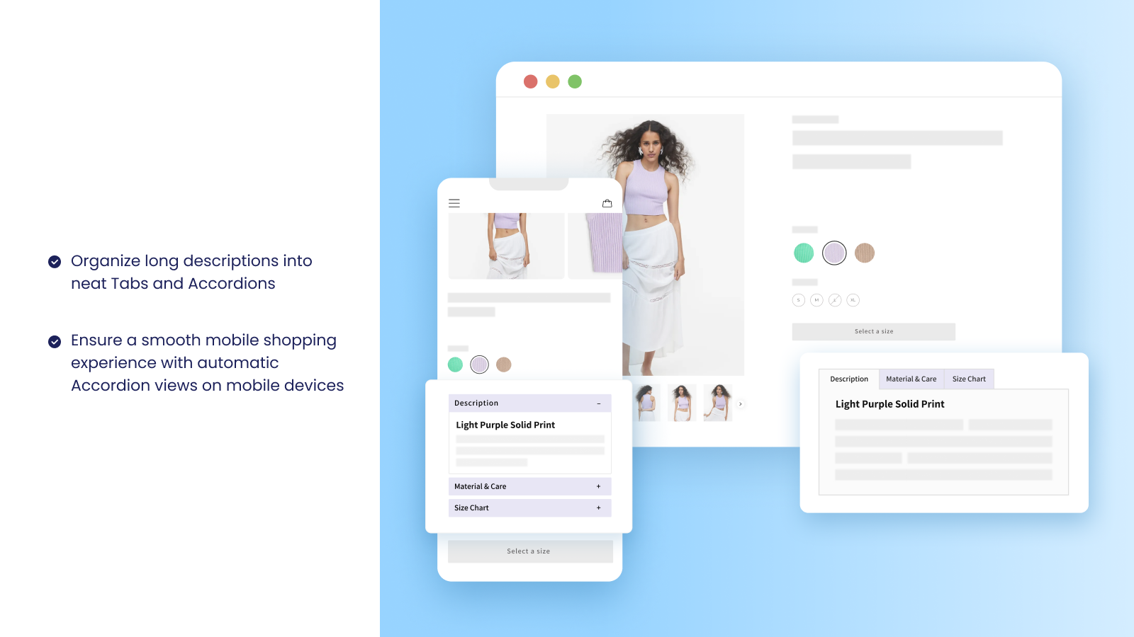 Show different product information of the selected variant like size chart info, color details, care instructions, technical details, etc Organize long product descriptions in tabs or collapsible accordions Add collapsible accordions & Tabs to any page or theme section in your store like FAQ page, Returns & Privacy policy, Shipping info, T&C, Q&A section, etc Increase sales, minimize returns & customer support with detailed descriptions organized in tabs & accordions for every unique variant