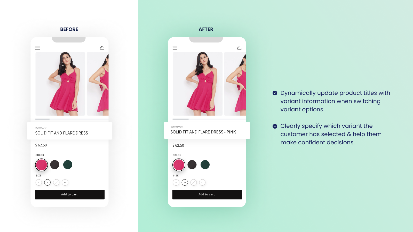 Change Product Title (Product Name) based on selected variant options. Clearly specify which variant the customer has selected & help them make confident decisions. Easy to use: Just create a product title template using variables in the app's dashboard. The Product Title template can include Variant Options info like Color Swatch Names, SKU, Product Type, Product Vendor, etc. Works with all themes & top variant apps like Swatch King, Variant Image Automator, Variant Descriptions King, etc.