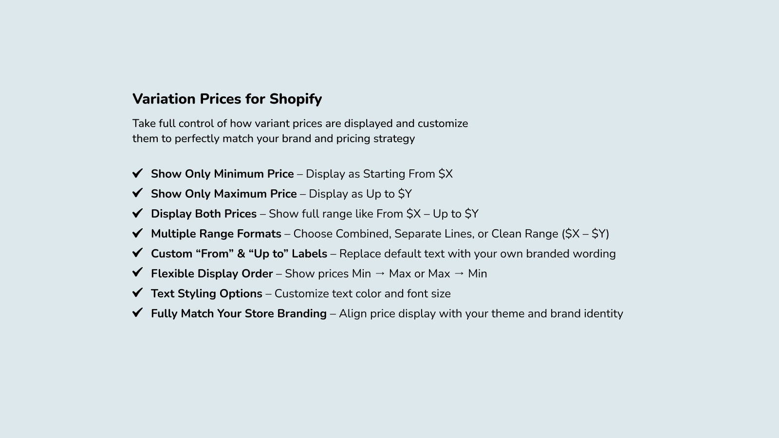 Our app lets merchants control how variant prices are displayed on their products. It replaces the default Shopify price range with options to show only the minimum, only the maximum, or both prices. Merchants can choose different display formats, customize labels, adjust the order of prices, and style the text to match their store theme. This helps improve price clarity and enhances the shopping experience for customers.