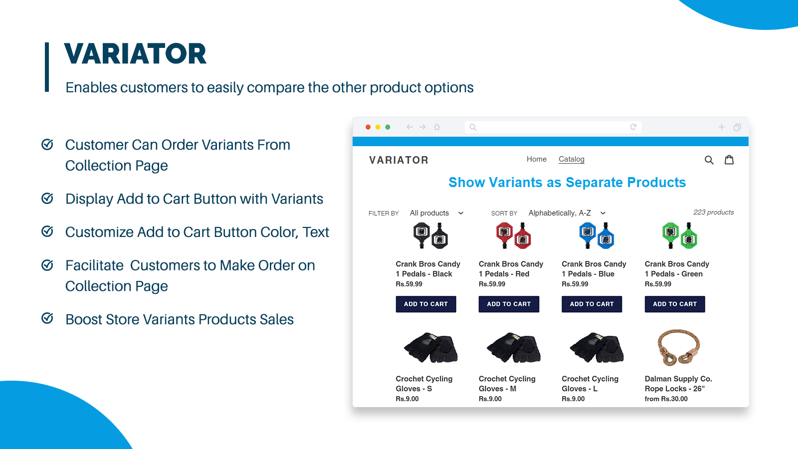 Variator App displays infinite variants on collection. This allows users to find the right product directly from the shop without having to open a product and select the product variant from the drop-down. Variator app lets merchants enable an “Add to cart” button with product variants on the shop page so customers can directly add variants to their cart and checkout. Merchants customize the “Add to cart” Button. Show variants on collection and maximize variants product pages conversions