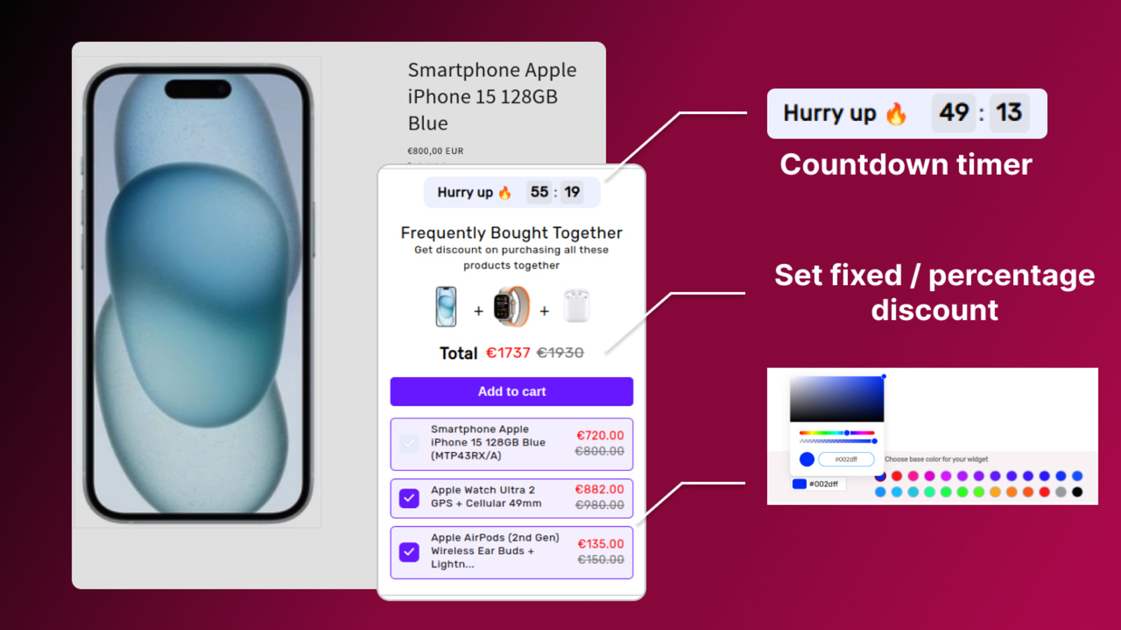 The app helps improve bundle sales by analyzing previous purchases and recommending additional products that complement the main item. You can also manually configure recommendations for specific products. Three great templates and easy customization make it simple to integrate the widget into any store design. The app also enhances customer engagement with smart product recommendations and urgency features.