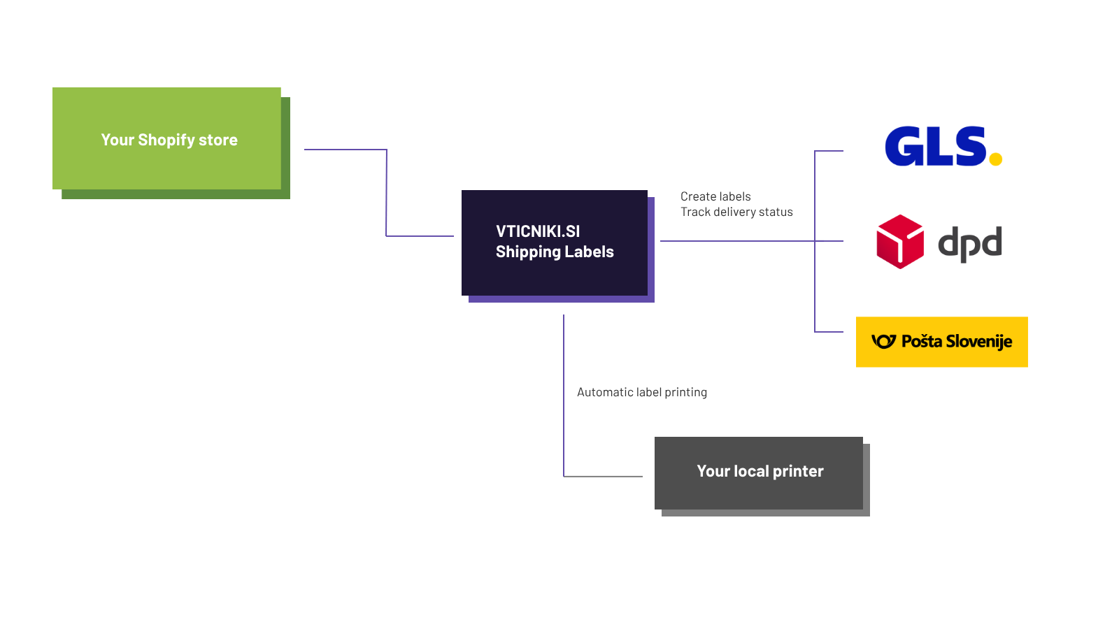 Easily create labels for popular Slovenian shopping companies. Track package delivery with automatic status update. Connect service with your external printer to directly print all the labels.