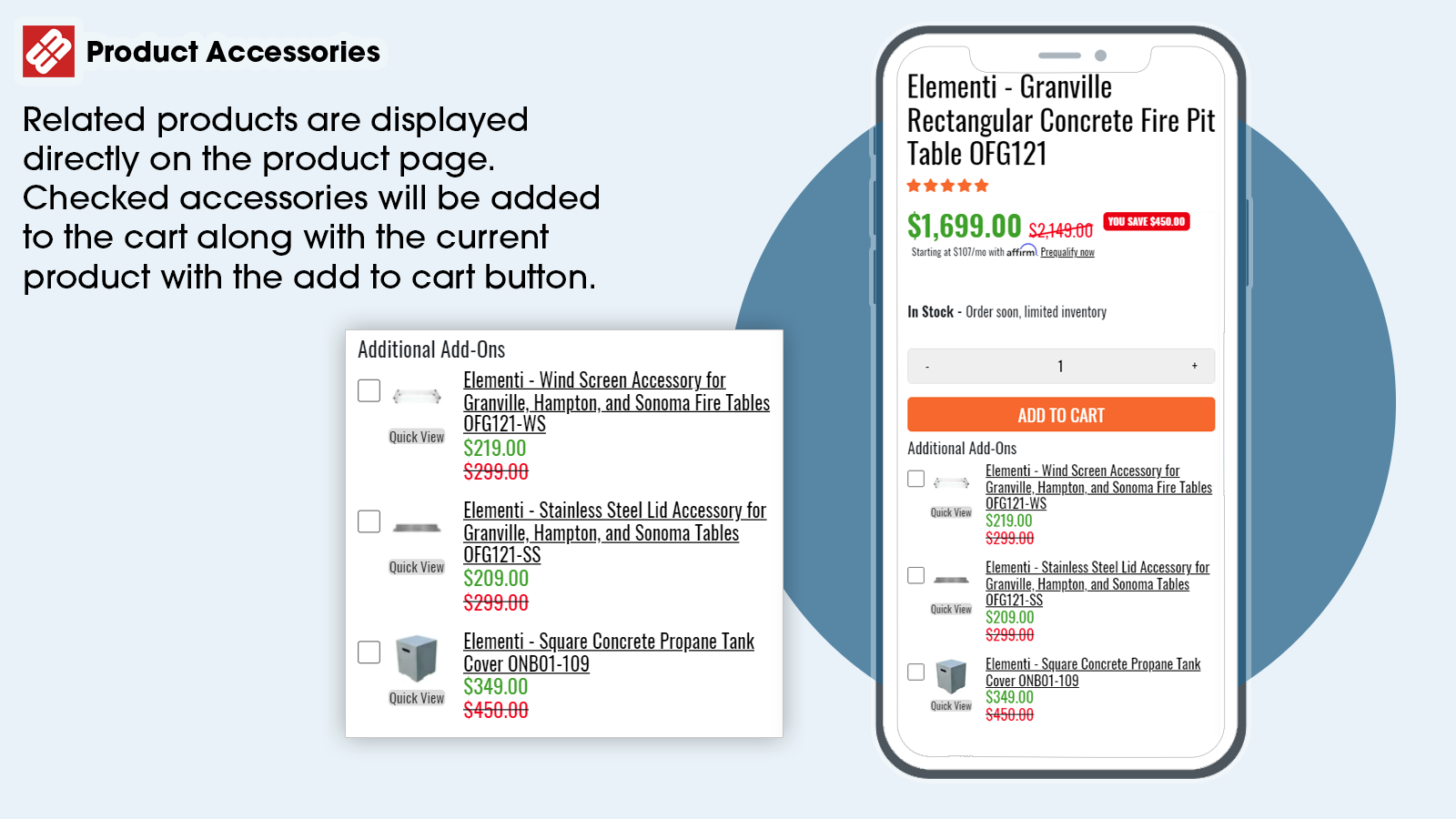 Making it easy to add additional products is one of the best and easiest ways to boost the value of each order. Product Accessories requires just one click for your customer to add additional products to their cart. Your customers will be able to add all the accessories they need. For example, extra batteries, charger cables, attachments, or similarly styled clothing.
